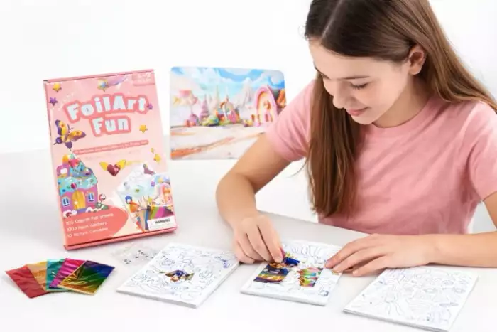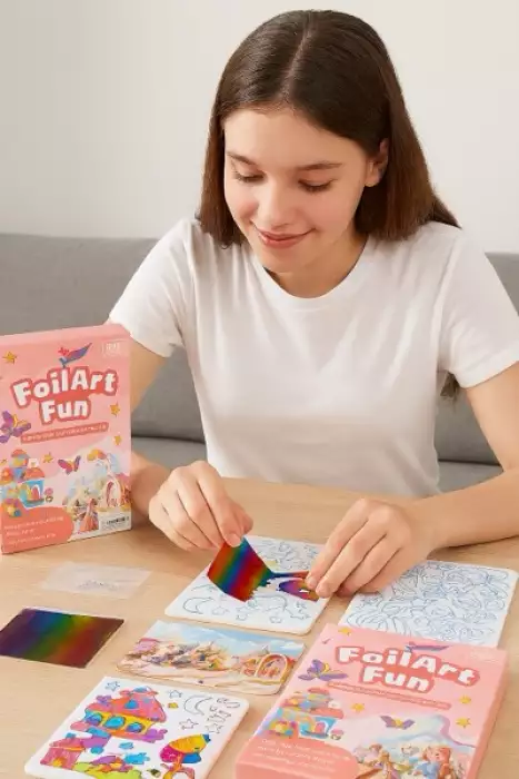 Foil Art Fun is an enchanting arts and crafts kit designed to spark creativity and imagination in young artists. This delightful press and peel activity set features whimsical themes including unicorns, princesses, and dolls that will captivate children for hours. The kit includes 100 colourful foil sheets that transform ordinary outlines into dazzling, shimmering masterpieces. Simply peel away sections of the pre-designed templates and press the vibrant foil sheets onto the sticky surface to create stunning, eye-catching artwork. The process is wonderfully satisfying and helps develop fine motor skills, hand-eye coordination, and artistic confidence. Each design comes to life with brilliant metallic colours, featuring magical scenes with butterflies, castles, hearts, and enchanting characters. Perfect for rainy day activities, birthday parties, or quiet creative time, this craft kit provides everything needed to create beautiful foil art. The easy press-and-peel technique makes it accessible for various skill levels, allowing children to produce professional-looking results they'll be proud to display or gift to loved ones. This comprehensive kit offers endless artistic possibilities and guarantees hours of engaging, screen-free entertainment
